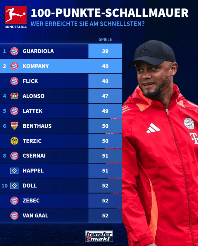 瓜迪奥拉(拜仁)——39场孔帕尼(拜仁)——40场弗里克(拜仁)——40场阿隆索(勒沃库森)——47场拉特克(拜仁)——49场本特奥斯(斯图加特)——50场泰尔齐奇(多特蒙德)——50场策纳伊(拜仁)——51场哈佩尔(汉堡)——51场多尔(汉堡)——52场泽贝茨(拜仁)——52场范加尔(拜仁)——52场从数据上看,瓜迪奥拉的统治级表现依旧无人能敌。他仅用39场便拿到100分的惊人效率,展现了当年拜仁在他的战术体系下所达到的恐怖稳定性。而孔帕尼则成为继弗里克之后,最快带队达到百积分的拜仁主帅之一,预示着他有望在未来延续拜仁的辉煌传统。